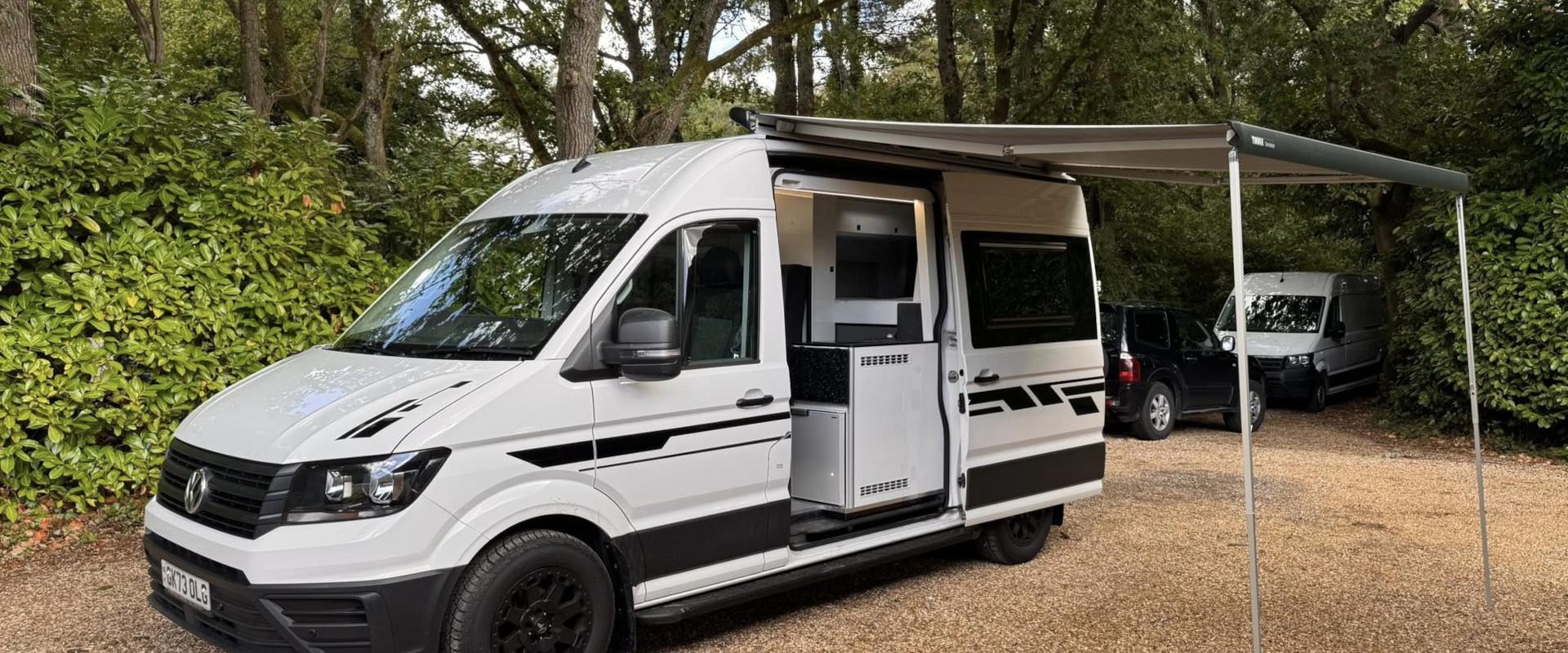 END OF SEASON SALE... FunkyDubz Medium Wheel Base Off Grid 140PS 6 Speed High Roof Crafter with 5 travelling seats, designed with immense practicality in mind, includes storage for your toys. Large fixed solar panel with lithium battery and mains hook up. Totally gas free, Diesel hob, heating and hot water. External Shower. Black Thule 6300 Wind Out Awning. Fresh and waste water storage tanks. An audio system with Feelart 8 OneSub; amp/bluetooth/sub and rear Kenwood speakers that either work from your factory head unit (with apple carplay) or stand alone when camping via bluetooth. Double bed above the garage area which can fold away for easy access, with comfy mattress. Tested double seatbed in living area which folds forward and to the side into a bed for two along with the swivelled front seats. Three good sized fixed roof lights (with blind and flyscreen), offside sliding window and nearside hinged opener, both double glazed with blinds & flyscreen, also side pods for rear bed for extra length finished in black to match windows. Storage wise there are pods above beds, a tall slide out storage unit and various storage areas. Kitchen area has diesel ceramic hob, accessible both..